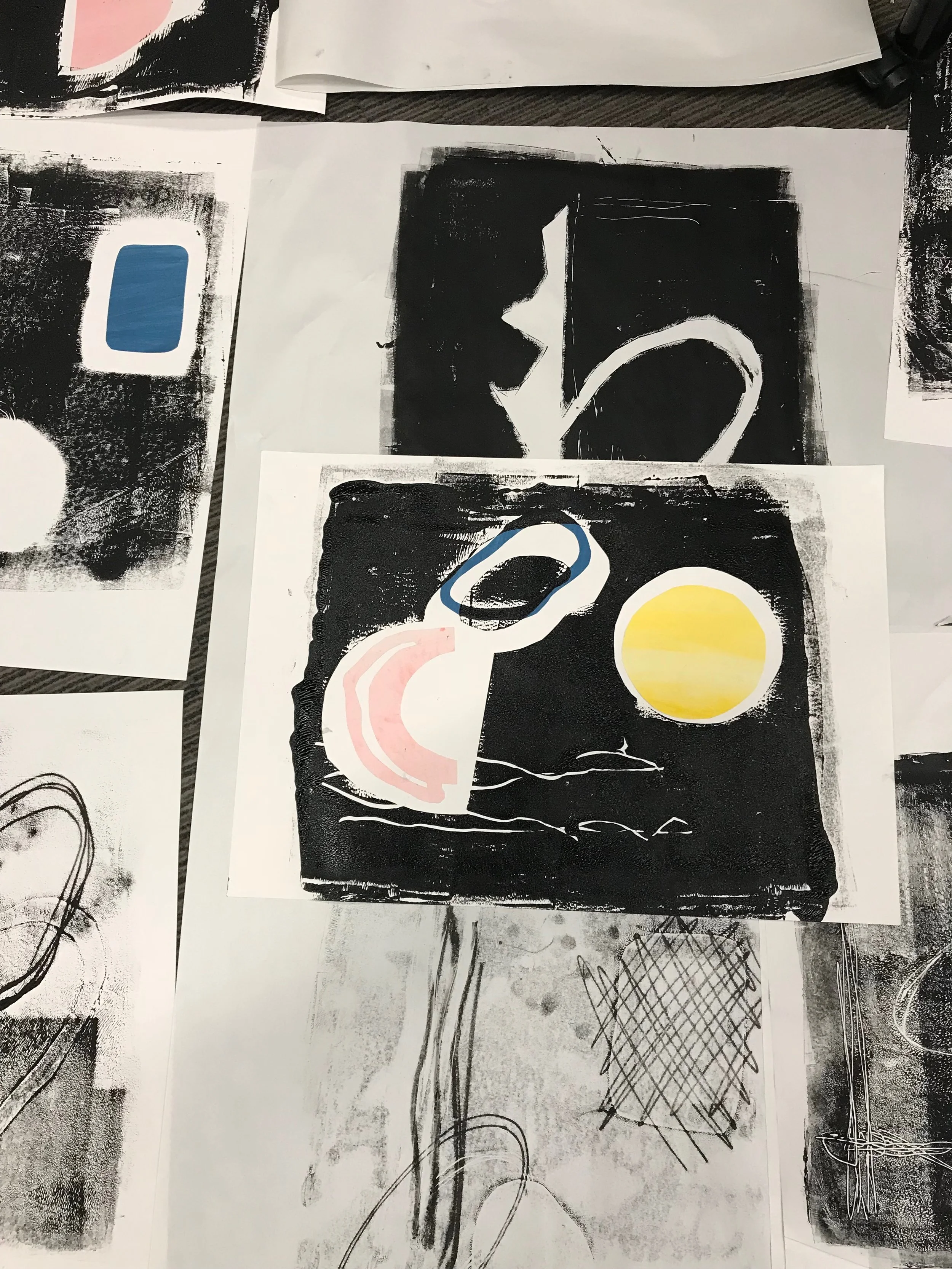 In the afternoon, the students utilised mono print, experimenting with linear drawings, collage and texture. They then worked in groups to create large-scale collages from their initial drawings, mono prints and textures.